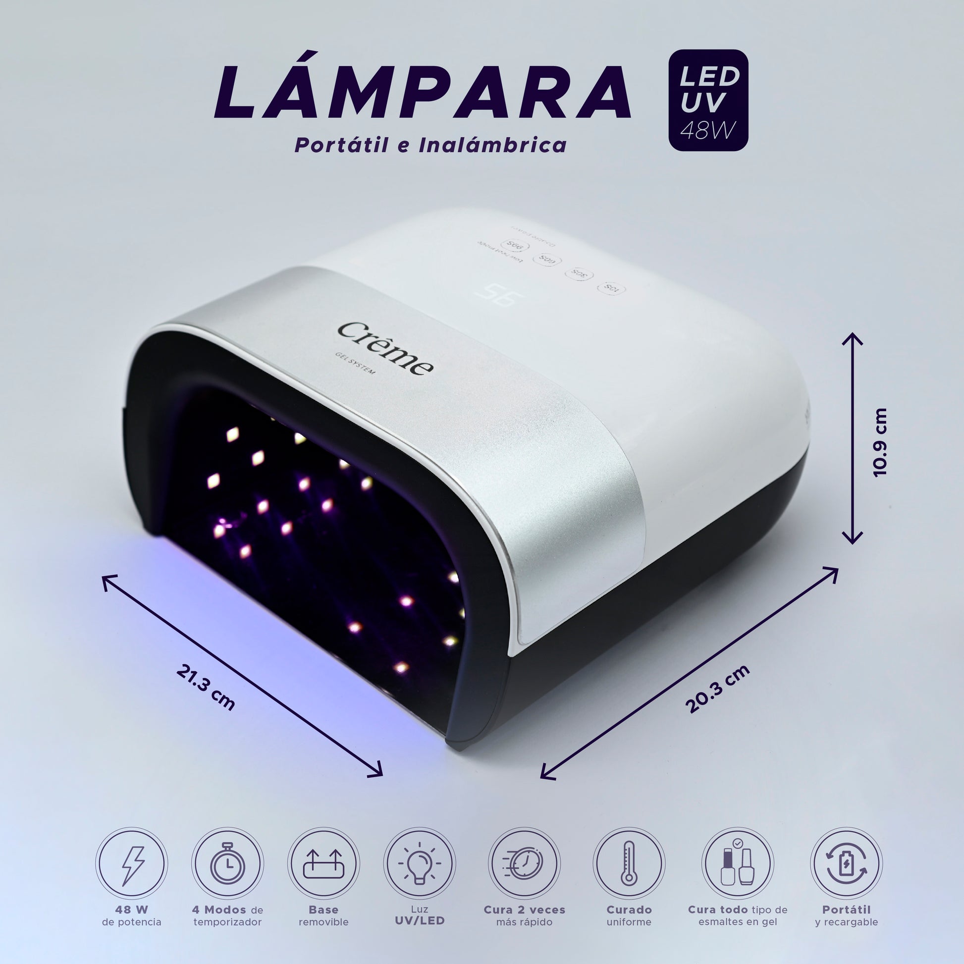 - Lámpara LED/UV 48 W: Secado rápido y seguro en segundos.