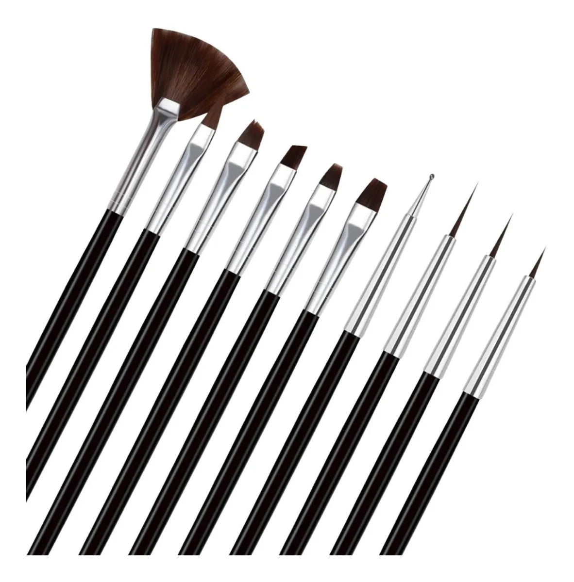 Paquete de 10 pinceles para decoración de uñas. Incluye liners de diferente grosor y largo, un puntero, pinceles para esmaltar en diferentes técnicas.